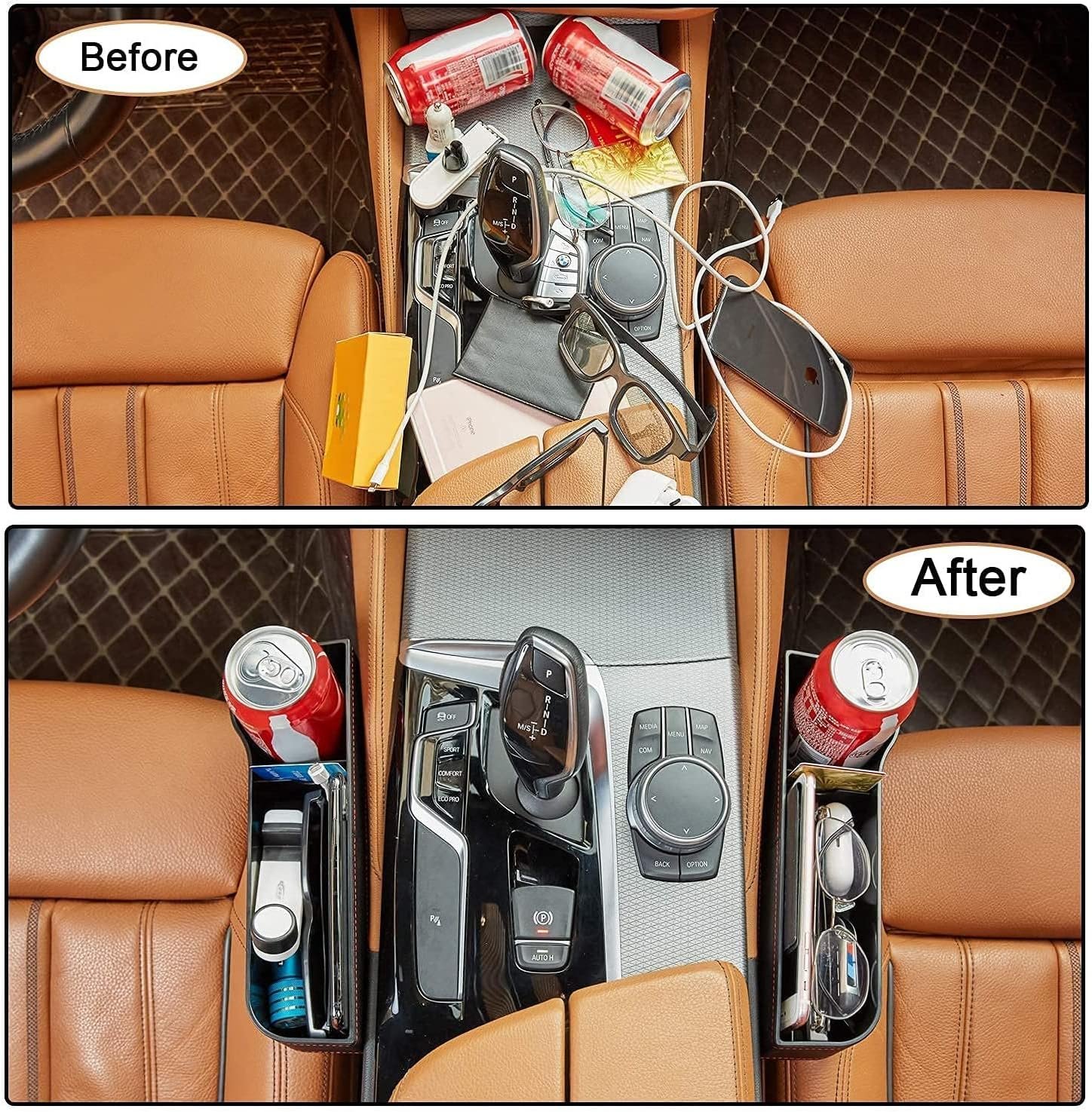 The easiest way to keep your car neat, tidy, and organized. And the best part? NO MORE items falling through the gaps!